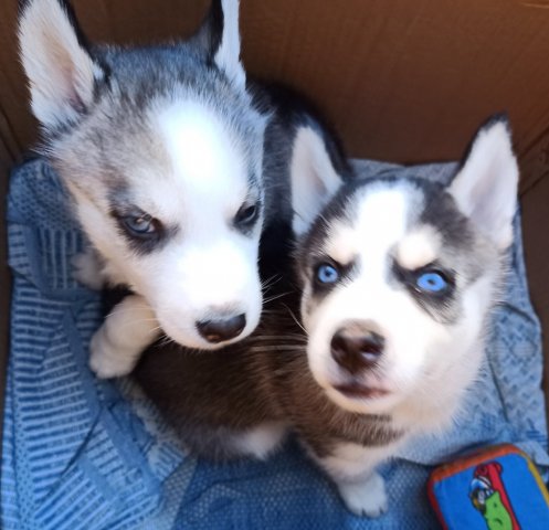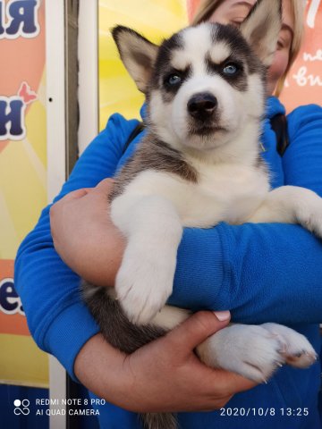 Щенки хаски мальчики родились 28.08.окрас чёрно- белый и серо-белый.глаза голубые.черные.арлекин.кушают сами.проглистованы.от чистокровных родителей.