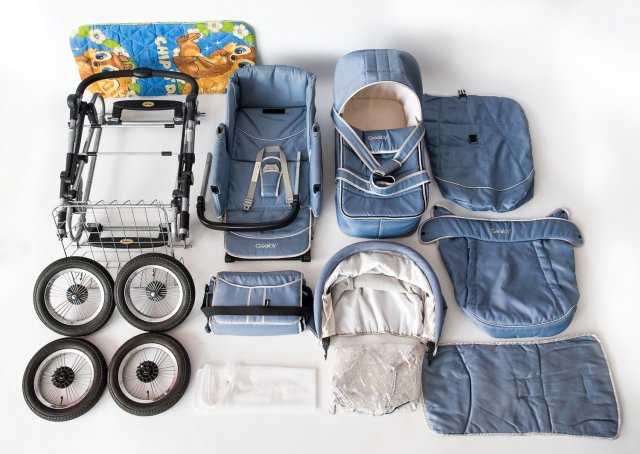 рама-шасси, люлька-короб, люлька-переноска, козырек-капюшон, чехол-короб, чехол-полог, матрас-вкладка, ортопедический кокосовый матрас (приобретался отдельно), противомоскитная сетка, дождевик, сумка для мамы, 4 колеса, корзина-багажник, инструкция и гарантийный талон.