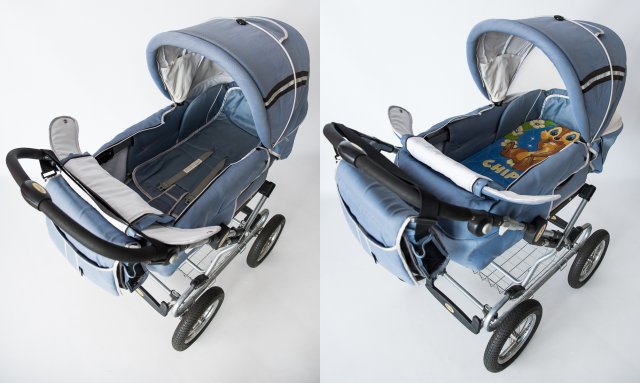— вторая дополнительная мобильная люлька-переноска с удобными ручками, капюшоном и накидкой на всесторонней молнии (для быстрой переноски ребёнка из коляски в помещение, по лестнице на этажи, в лифт, в магазин, в больницу и т.д., где не представляется быстрым, удобным или вообще возможным продвижение с коляской);