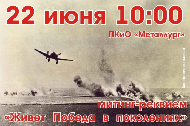 22 июня 10:00 ПКиО «Металлург» возле памятника погибшим воинам состоится митинг-реквием «Живет Победа в поколениях». Организатор: Константиновский городской исполнительный комитет.