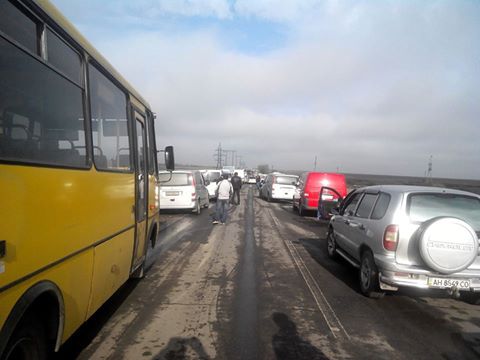— На Донецк стоим возле последнего МЖ, впереди машин 40 и сзади столько же.Чуть проехали.