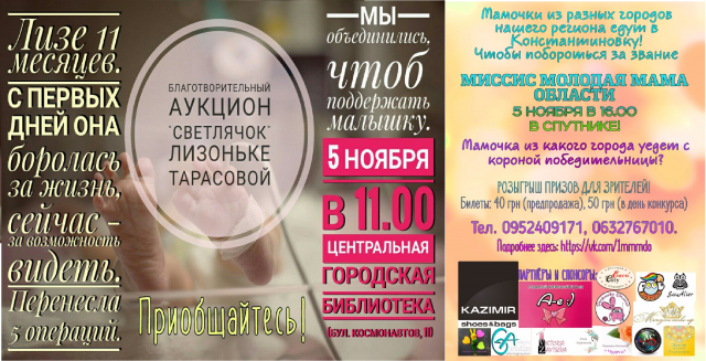 Все вырученные средствабудут переданы родителям девочки Лизы.  Ребенок не видит. Ей всего 11 месяцев, она пережила уже 5 операций. тот маленький, но очень храбрый и жизнелюбивыйчеловечек ждет и нашей с Вами помощи. Потому оставьте се заботы и приходите на аукцион приобрести изделие ручной работы, сертификат на полезную услугу, просто новую и хорошую вещь.