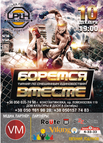 10 декабря под сводами Дома культуры и досуга в городе Константиновка Донецкой области состоится турнир по смешанным единоборствам «Боремся Вместе». На турнире пройдет 10 боев.