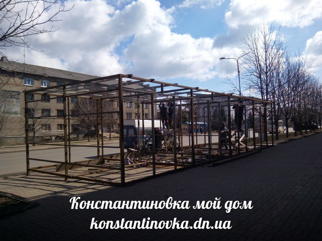 По проспекту Ломоносова в центре Константиновки снесли автобусную остановку и строят павильон.
