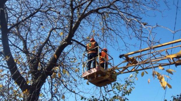 Хоть уже и декабрь, но на улице тепло, и электрики решили обрезать ветви деревьев над проводами. Обычно они это делают в теплое время года.