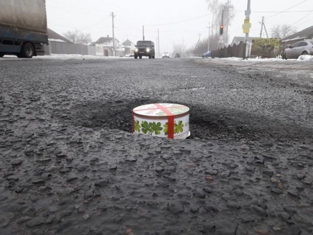 Харьковские автолюбители с юмором подошли к измерению ям на дорогах области и сделали фото, взяв в качестве эталона «Киевский торт», размеры которого известны каждому украинцу.