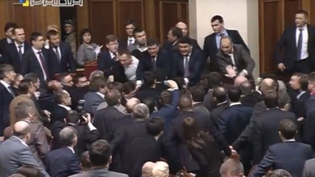 Народные депутаты Украины сорвали выступление премьер-министра Украины Арсения Яценюка, окружив трибуну и устроив потасовку с министрами Кабинета министров.