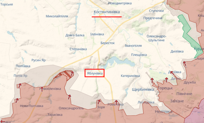 «Противник продвинулся на юг и закрепился в пределах села Яблоновка. Таким образом, зона боевого столкновения приближается непосредственно к пригородам Константиновки», — говорится в ежедневной сводке DeepState.