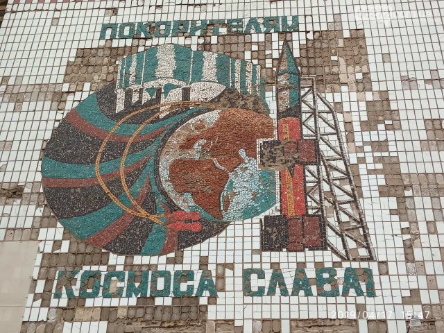 Мозаичное панно «Покорителям космоса слава!» ( «Покорители космоса слава») б.Космонавтив 4. Имеет местное значение. Относится к монументальному вида искусства. Сейчас имеет неудовлетворительное состояние.