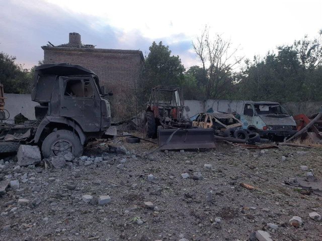 Повреждено хозяйственное помещение теплосети. Также от обстрела пострадали автомобили спасателей, прибывшие для подвоза воды жителям города.