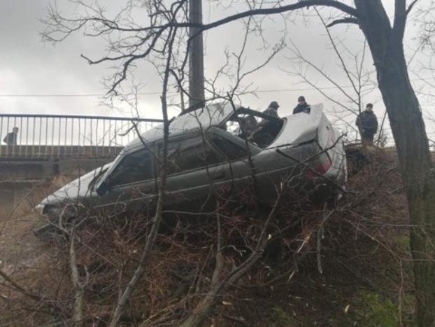 Автомобиль пересёк встречную полосу, врезался в столб и ограждение моста и упал в обрыв. От падения в речку машину спасли деревья.