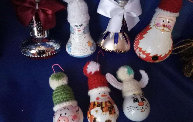 На выставке представлены также авторские новогодние игрушки художницы Ольги Сабадин, которая из обыкновенных электрических лампочек создала новогоднюю сказку.