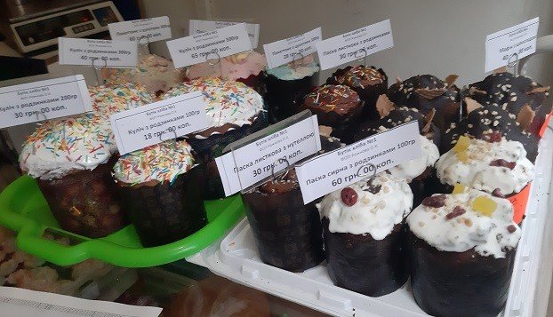 Самые маленькие паски, весом 100-120 граммов стоили 15-18 грн, чуть больше (180-200 граммов) – 24-30 грн. И изделия весом 350–400 граммов продавали по 48-50 грн. Были и паски в упаковке, привезенные из Днепра, весом 500 граммов стоимостью 170 грн.
