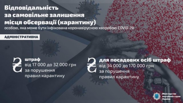 Кодекс Украины об административных правонарушениях дополнен ст. 44-3 «Нарушение правил карантина людей», согласно которой нарушение правил карантина людей, санитарно-гигиенических, санитарно-противоэпидемических правил и норм, предусмотренных Законом Украины «О защите населения от инфекционных болезней», другими актами законодательства, а также решений органов местного самоуправления по вопросам борьбы с инфекционными заболеваниями, влечет за собой наложение штрафа на граждан от одной до двух тысяч необлагаемых минимумов доходов граждан, на должностных лиц — в размере от двух до десяти тысяч неоп атковуваних минимумов доходов граждан.