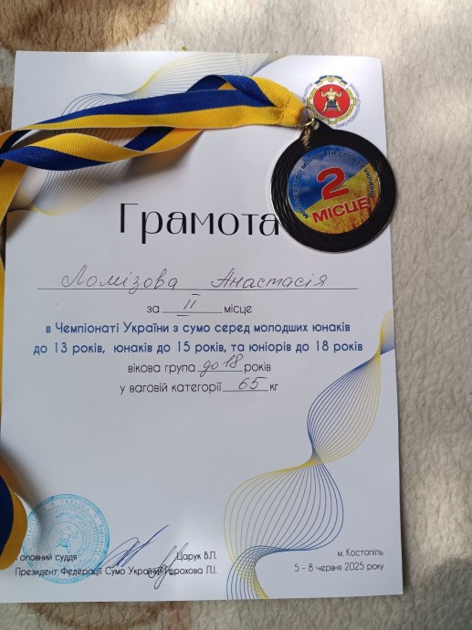 Еще один триумф – mdash; Ломизова Анастасия, ученица 9-А класса ЗЗСО №6, стала дважды серебряным призером — в категориях U-15 и U-18. Она также получила путевку в Эстонию, доказав, что сила, техника и выдержка не имеют возраста.