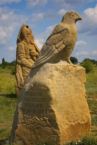 С высокого пригорка за порядком вверенной ему территории через века зорко следит скифский царь Колоксай под охраной сокола — хранителя божественного Солнца, за спиной у которого минувшее (птеродактиль и динозавры), а взгляд обращен в настоящее.