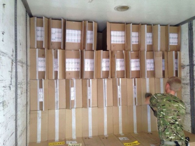 Во время осмотра указанного автомобиля на предмет выявления вещей и предметов, которые незаконно перевозятся через линию разграничения, в грузовом отсеке выявлено и изъято 384000 пачек сигарет марки "НЗ", "Минск", "Фест", "Магнат" и "Премьер" без марок акцизного налога установленного образца и без сопроводительных документов на табачные изделия на общую сумму 7590 тыс. гривен.