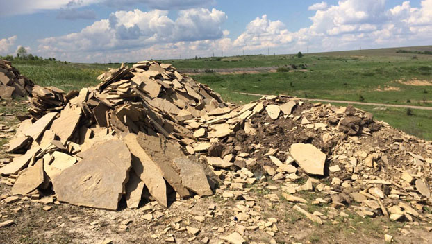 Подъехав на место, журналисты увидели, что нелегальный рабочий процесс как раз в самом разгаре. Чтобы зафиксировать правонарушение, было принято решение вызвать на место наряд полиции. «Копатели» также заметили, что за ними наблюдают, поэтому быстро начали «сворачиваться»: техника уехала в одну сторону, люди удалились в другую. Через полчаса журналисты и оперативники уже исследовали каменоломни. Масштаб деятельности злоумышленников просто впечатлял: нещадно изрытая земля на несколько километров, десятки аккуратно сложенных кучек природного камня, уже подготовленного к отгрузке. Все указывало на то, что выработка песчаника здесь налажена в промышленных целях. При этом не надо быть экологом, чтобы понять, какой вред наносится окружающей среде и к каким негативным последствиям может привести беспорядочная добыча полезных ископаемых.