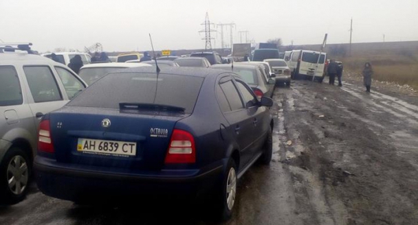 «11:50. На Еленовке, в сторону Мариуполя, очередь до остановки, пропускают очень медленно, за час сдвинулись на 50 машин, много льготных и вклиниваются с боковых заездов»