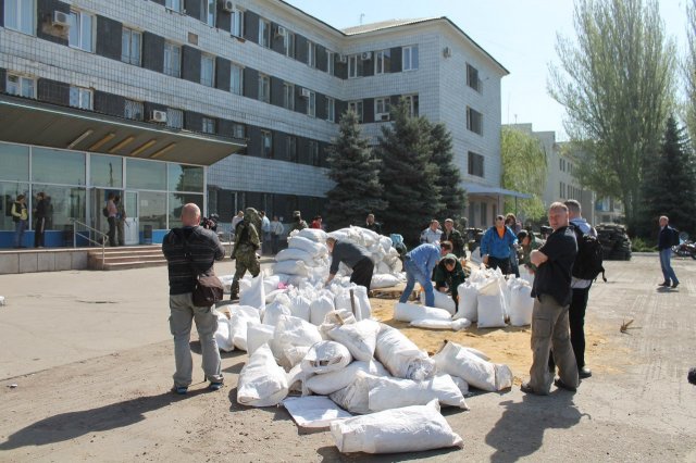 Сейчас возле исполкома горсовета находятся вооруженные автоматами люди. Чиновников в здание не пускают. Предприниматели города привозят песок, мешки, покрышки. Местные жители помогают строить баррикады и укрепления.
