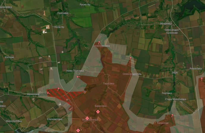 За даними DeepState, частково окуповане село Малинівка, розташоване прямо на трасі між Покровськом та Костянтинівкою. Водночас український військовослужбовець із позивним «Мучним» стверджує, що супротивник повністю захопив село.
