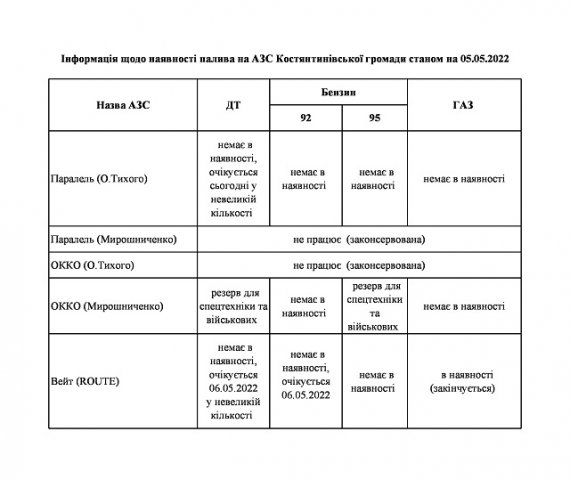 Информация о наличии топлива на АЗС Константиновской общины по состоянию на 05 мая 2022