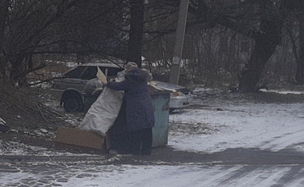 Этой женщине нет еще и 60, а на вид можно дать все 80. В контейнерах ищет бутылки, картон, бумагу, которые потом где-то сдает. Пенсии у нее нет и в скором времени не будет, так как не хватает стажа. Пьют они вдвоем с сыном, который тоже занимается таким промыслом.