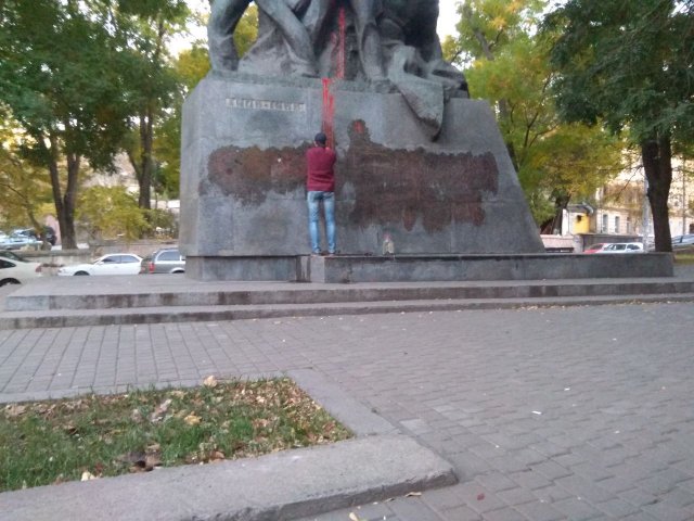 Отмечается, что памятник облили красной краской и написали на постаменте «Смерть червоним катам».